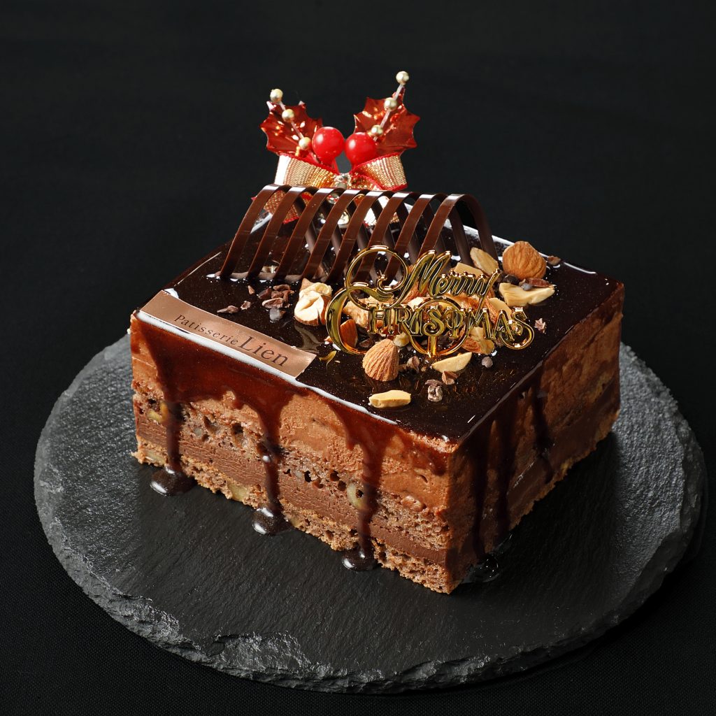 しっとりとしたチョコスポンジにはクルミをしのばせ、チョコガナッシュ、生チョコムースを重ね最後にグラサージュチョコを上からかけた濃厚なチョコ三昧のドリップケーキです。